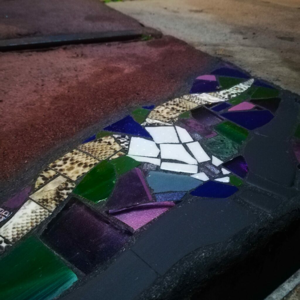 Inspirée des rituels de sorcières, cette mosaïque transforme une faille en espace symbolique, de feu et d’herbes.