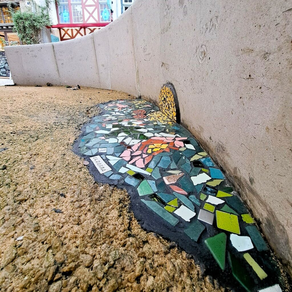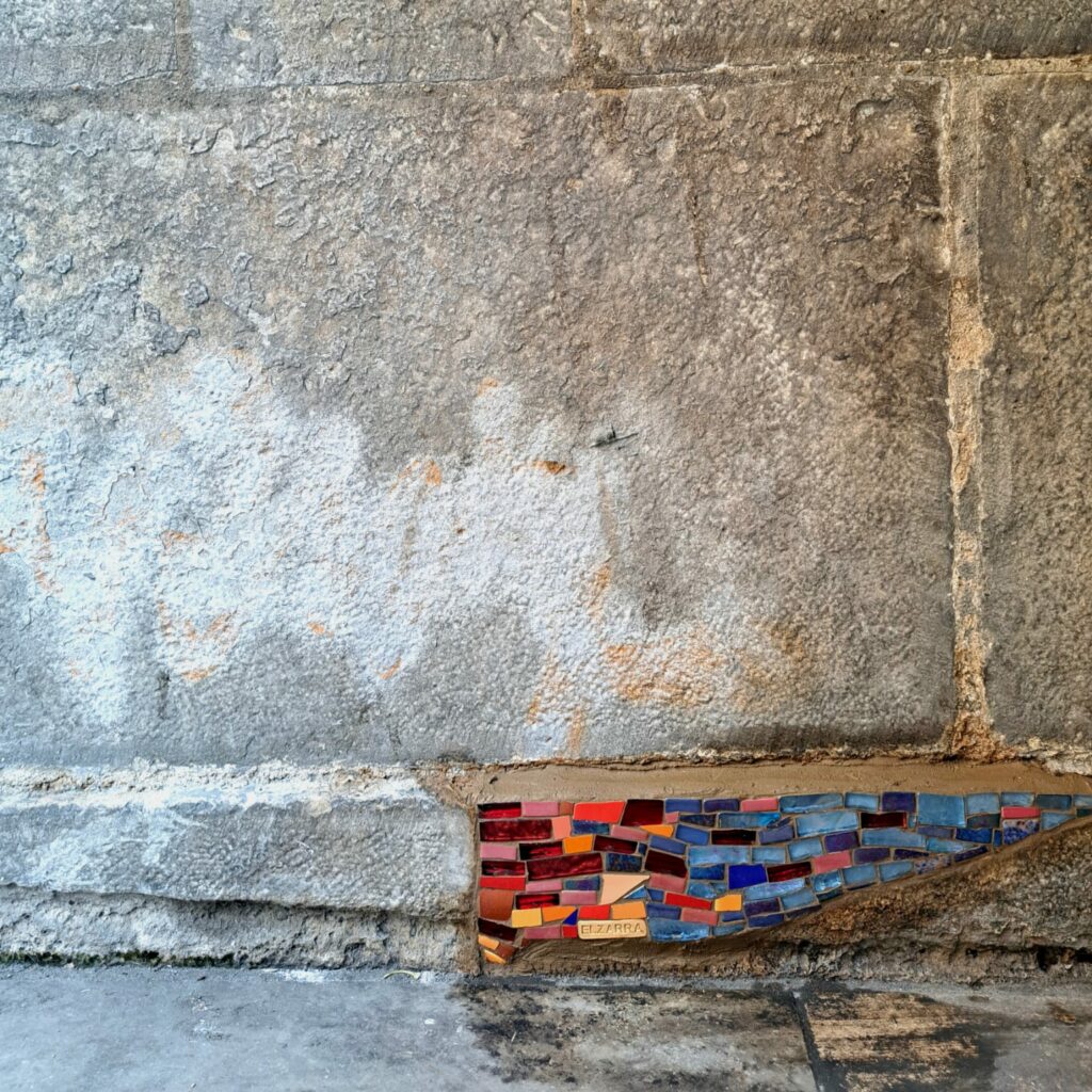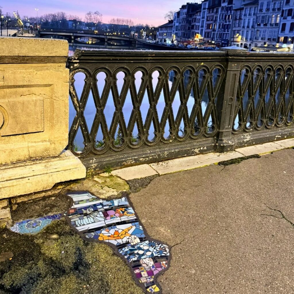 mosaique urbaine à Bayonne - artiste elzarra - réparation des trous de la ville avec de la mosaique - réparation des trottoires en mosaique à bayonne - flacking à bayonne